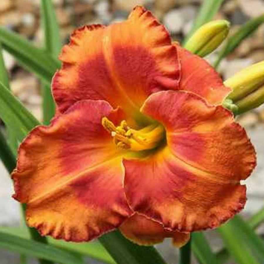 Высота до 70см. Диаметр цветков 17см.Оранжевый с красным пятном и красной гофрированной каймой и желтым горлом.