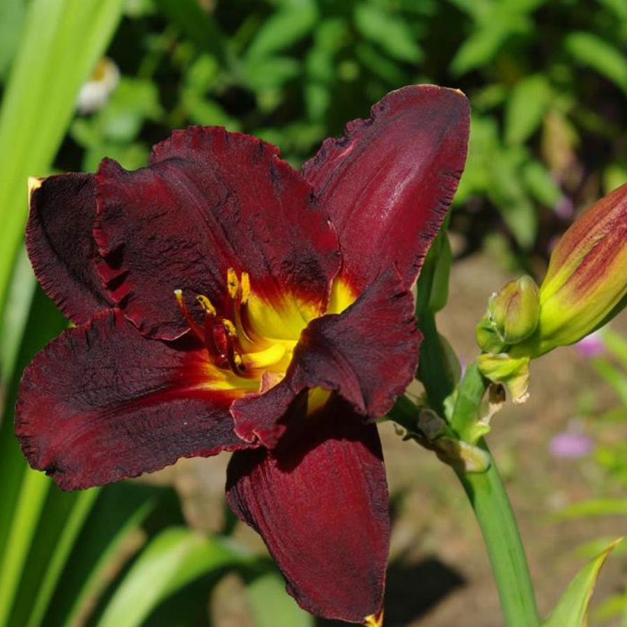 Гофрированный. Цветок бархатно-тёмно-лиловый с жёлтым горлом и каймой. Высота 50см, цветение июнь-август.