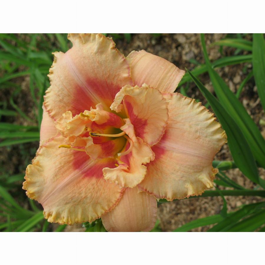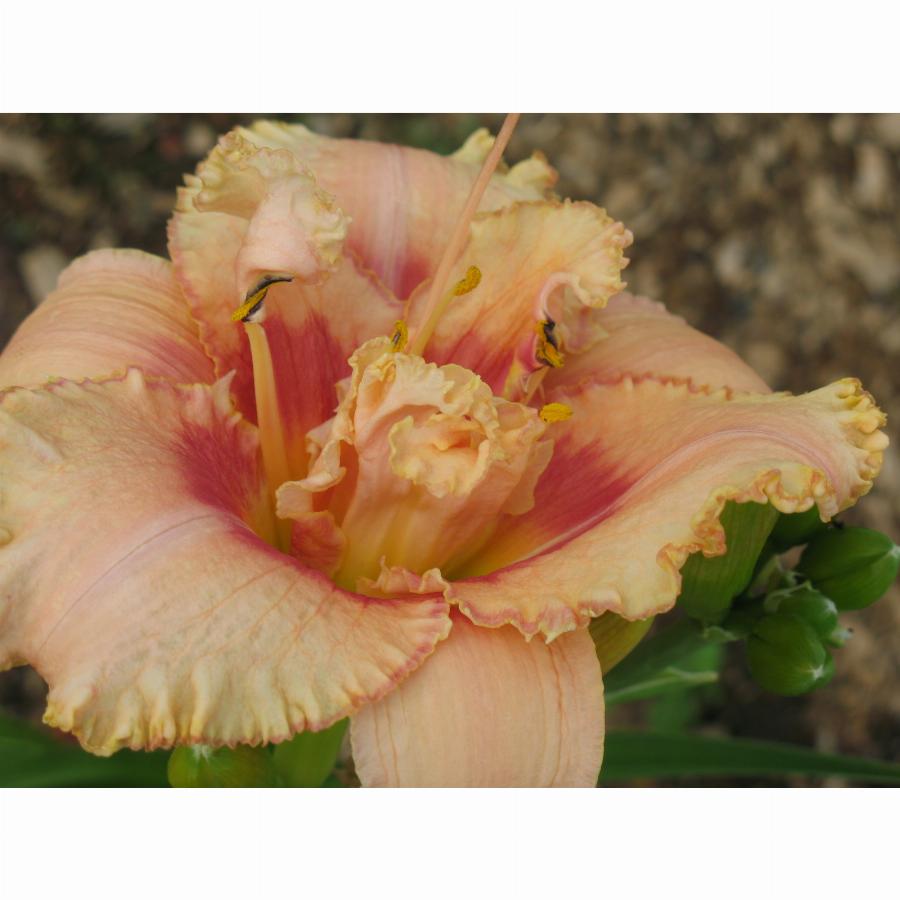 Гофрированный клубничного цвета с кремовым, до цвета манго, глазом и зеленым горлом.