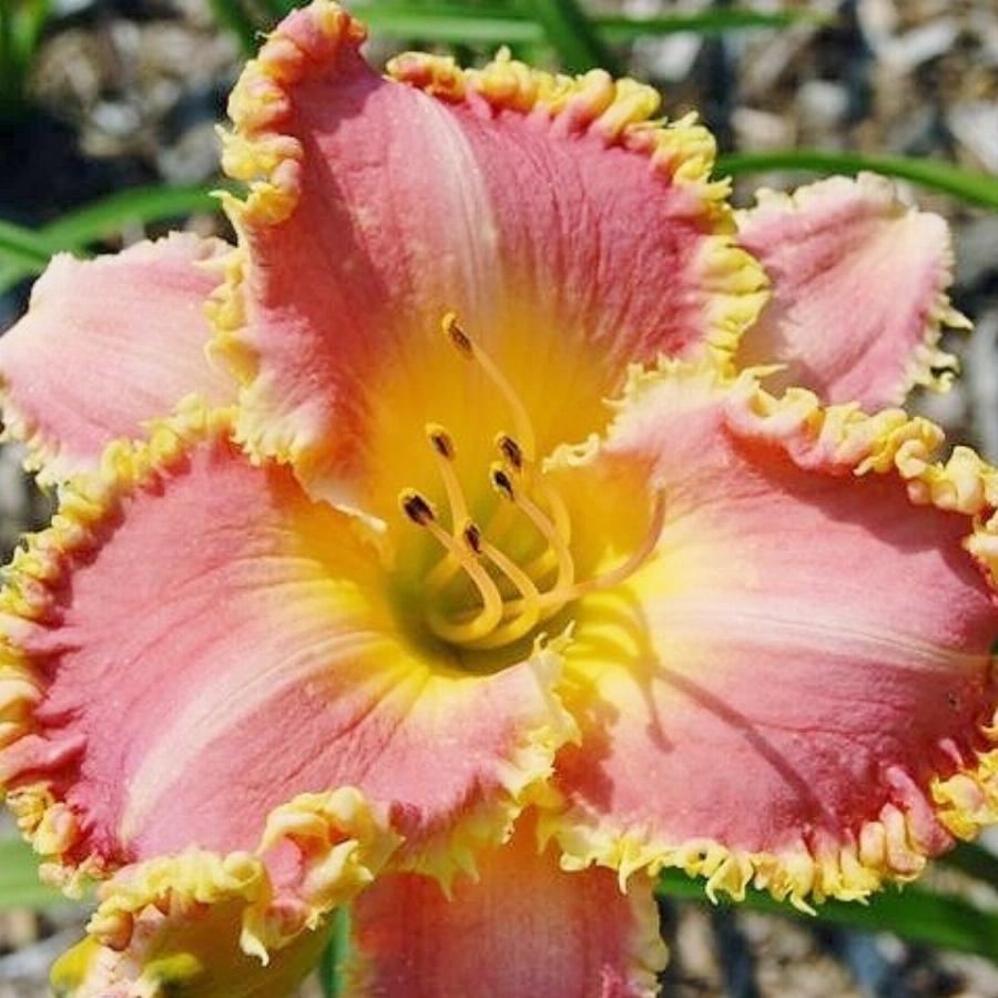 Лилейник круглой формы, первый и один из самых заметных из розовых зубатых сортов. Горло зеленовато-желтое, зубы и глаз очень желтые — прекрасное контрастное сочетание с основным розовым цветом. Куст ветвистый, в период цветения дает 12-15 бутонов, здоровая темно-зеленая листва устойчива к неблагоприятным условиям. Цветение повторное, обильное.