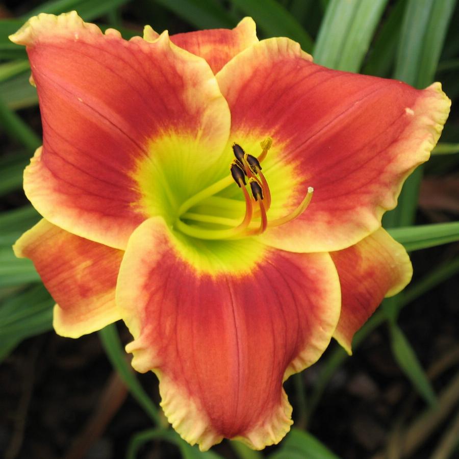 Высота — 30 см; диаметр цветка — 5 см. Среднеранний (конец июля); Красный с желтой окантовкой.