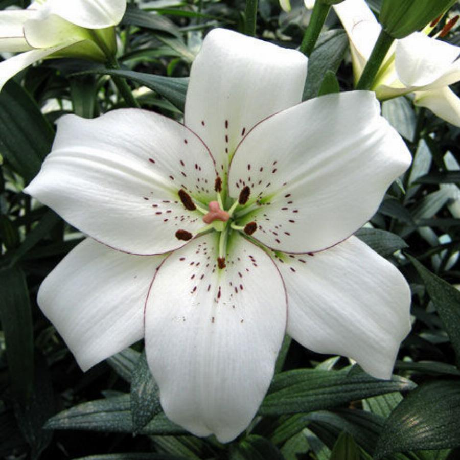 Высота растения 110 см. Цветки белоснежные с мелким крапом по центру. Диаметр цветка – 12-16 см, сроки цветения – июнь-июль.