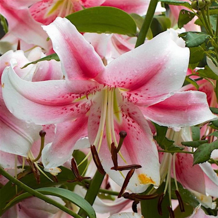Лилия Anastasia- Нежно-розовый с белыми краями, лепестки закрученные, с волнистым краем. Внутри в центре розовая с переходом к краям в белоснежную (цвет ярче в холодную погоду), папилломы розовые, пыльники коричневато-оранжевые. Лепестки слегка волнистые, сильно закрученные. Стебли грациозно изогнутые. (Columbia-Platte Lilies, 1998 )