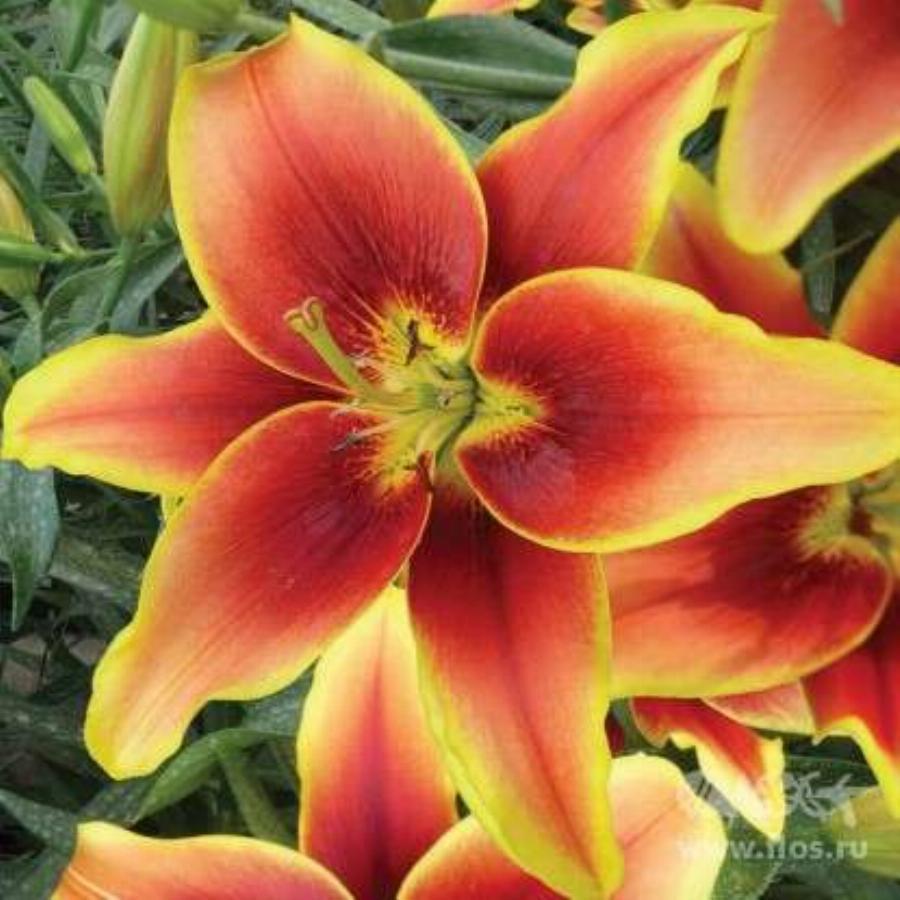 ОА гибриды лилий — новейшая группа лили.Отличаются крупными, широко раскрытыми цветами, с легким ароматом. Представители группы неприхотливы, абсолютно морозостойки. Бронзово-алая с желтой каймой и желтым центром, выглядит как пламя. Диаметр цветка 15-20 см, высота 100 см. Цветение в июле.
