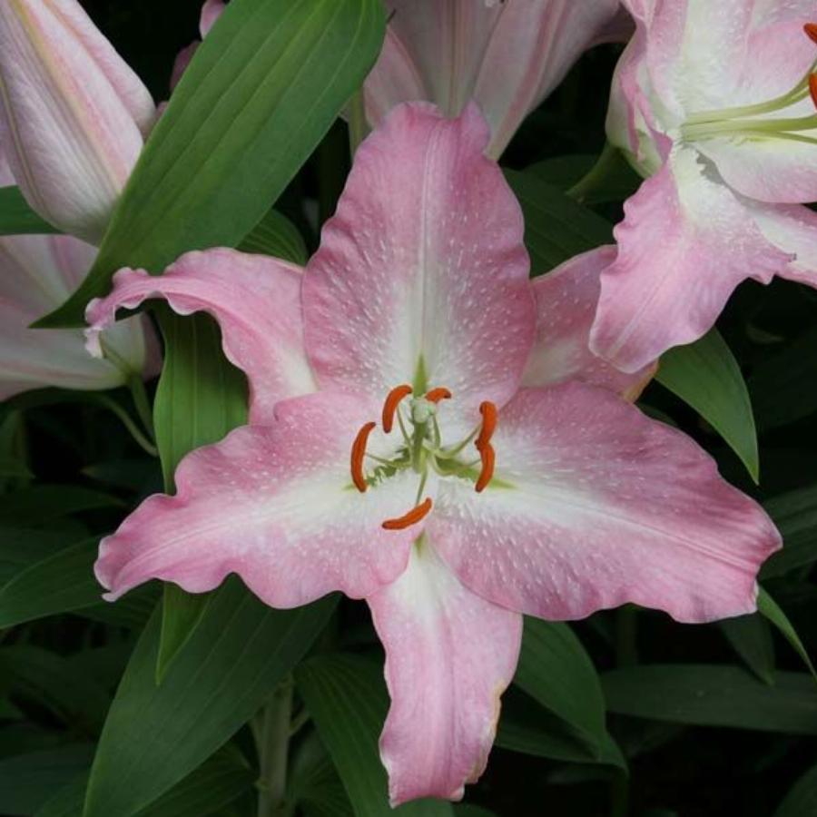 Белоснежная в горле с розоватыми кончиками лепестков. Края у лепестков волнистые, кончики чуть загнуты назад, тычинки оранжево-коричневые. Звездчатые цветки направлены вверх и в стороны. Аромат приятный, сильный. Диаметр цветка 15-20 см. Высота растения 0,9-1м. От всходов до цветения 100-110 дней.