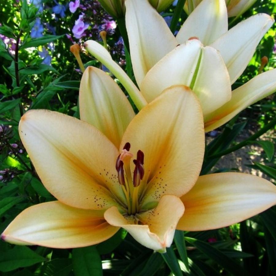 Кремово-ванильно-жёлтая с тёмным крапом в центре. Высота растения 105 см. 80 дней от посадки до цветения.