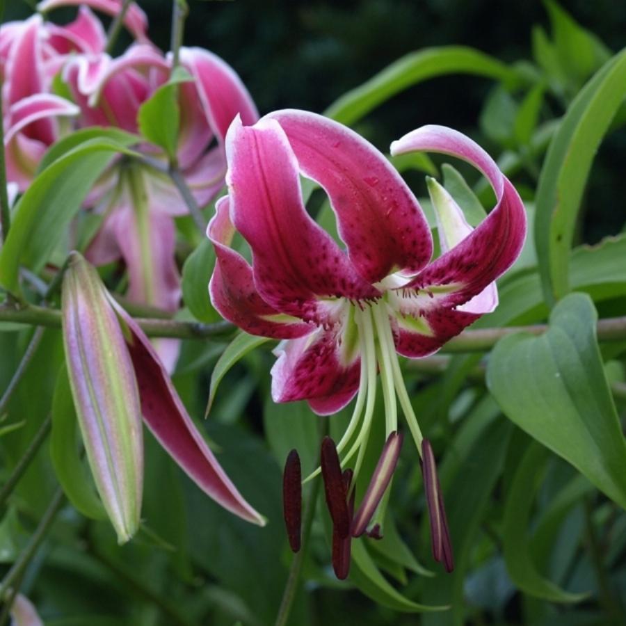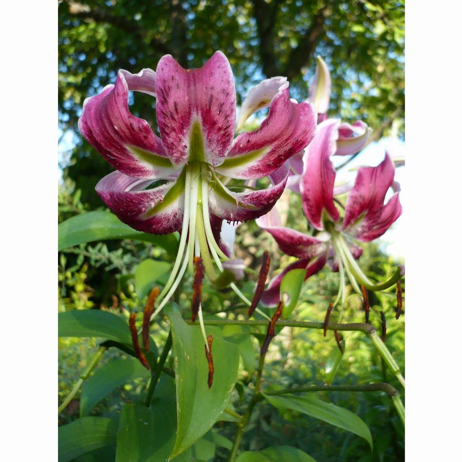 Вишнево-красная, с пурпурно-фиолетовым оттенком и узкой белой окантовкой по краю лепестка. Зеленое горло Диаметр цетка 8-15см. Цветки чалмовидные, направлены вниз, с очень длинными тычинками. Высота растения 100 см. От посадки до цветения 115 дней.