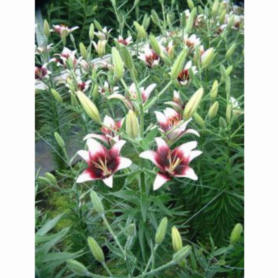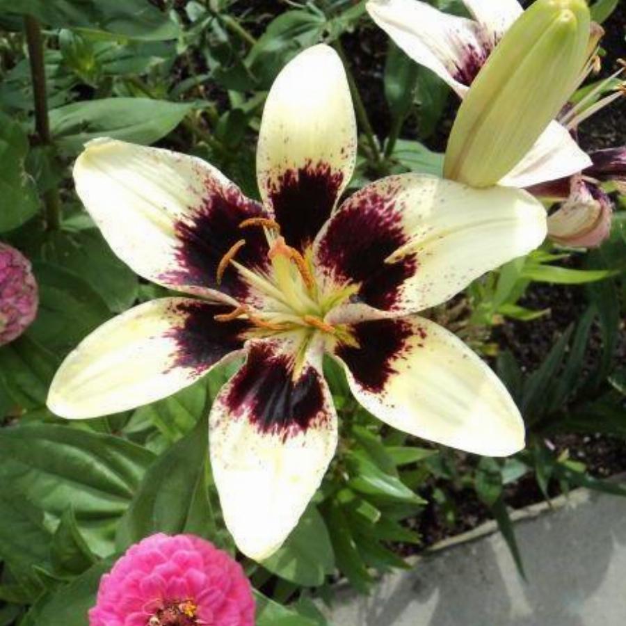 Кремово-желтый, у центра темно-пурпурные пятна с крапом, диаметр цветка- 20см. Высота растения 70-80 см.