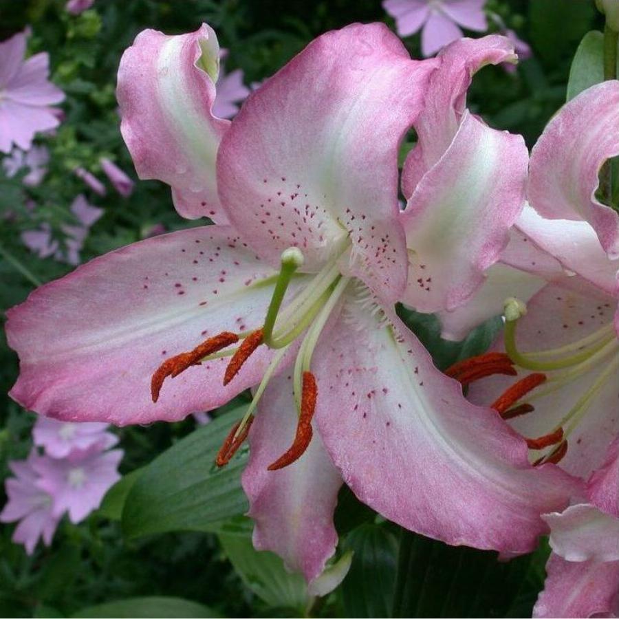 Высота растения 105см, цветок бледно-розовый с редким красным крапом, с яркой розовой каймой по краю,диаметр 22см.