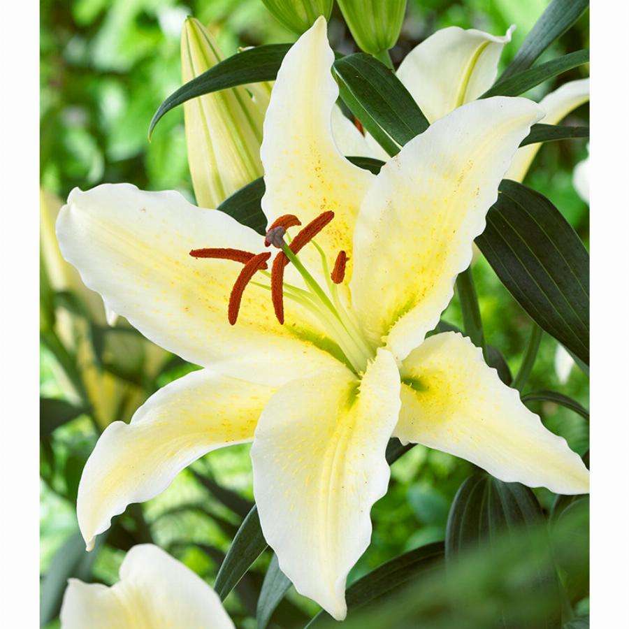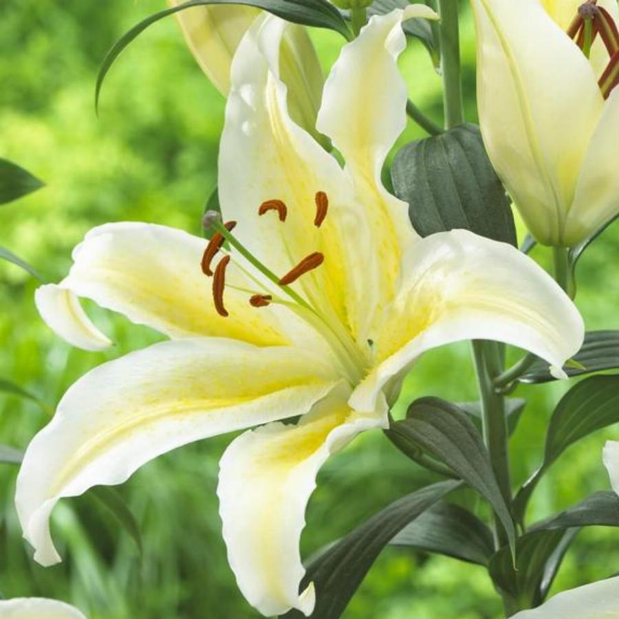Восточный гибрид. Элегантная ароматная белая лилия с широкой желтой полосой посередине лепестков. Диаметр цветка до 15 см. Цветок плоский, лепестки волнистые по краю, изящно загибаются назад. Пыльники оранжево-коричневые. Цветки направлены в стороны и вверх. Цветение: июль-август. От посадки до цветения примерно 120-130 дней. Высота растения 110 см, стебель прочный.