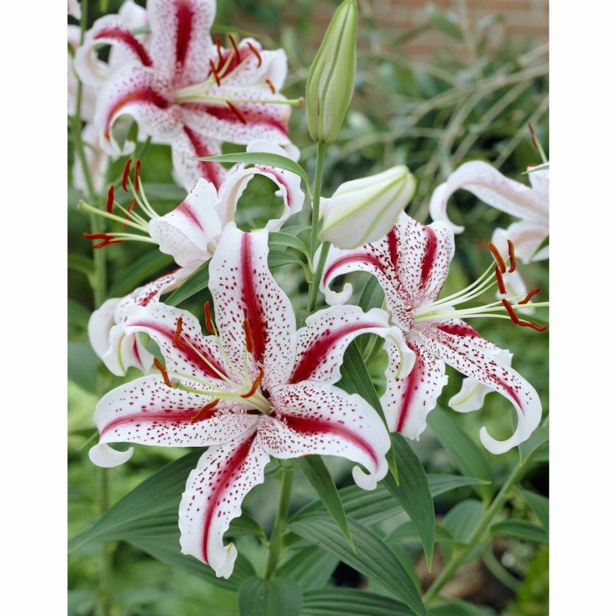 Высота растения 1 м, цветок белый с широкой малиновой полосой до конца лепестков и густым малиновым крапом.