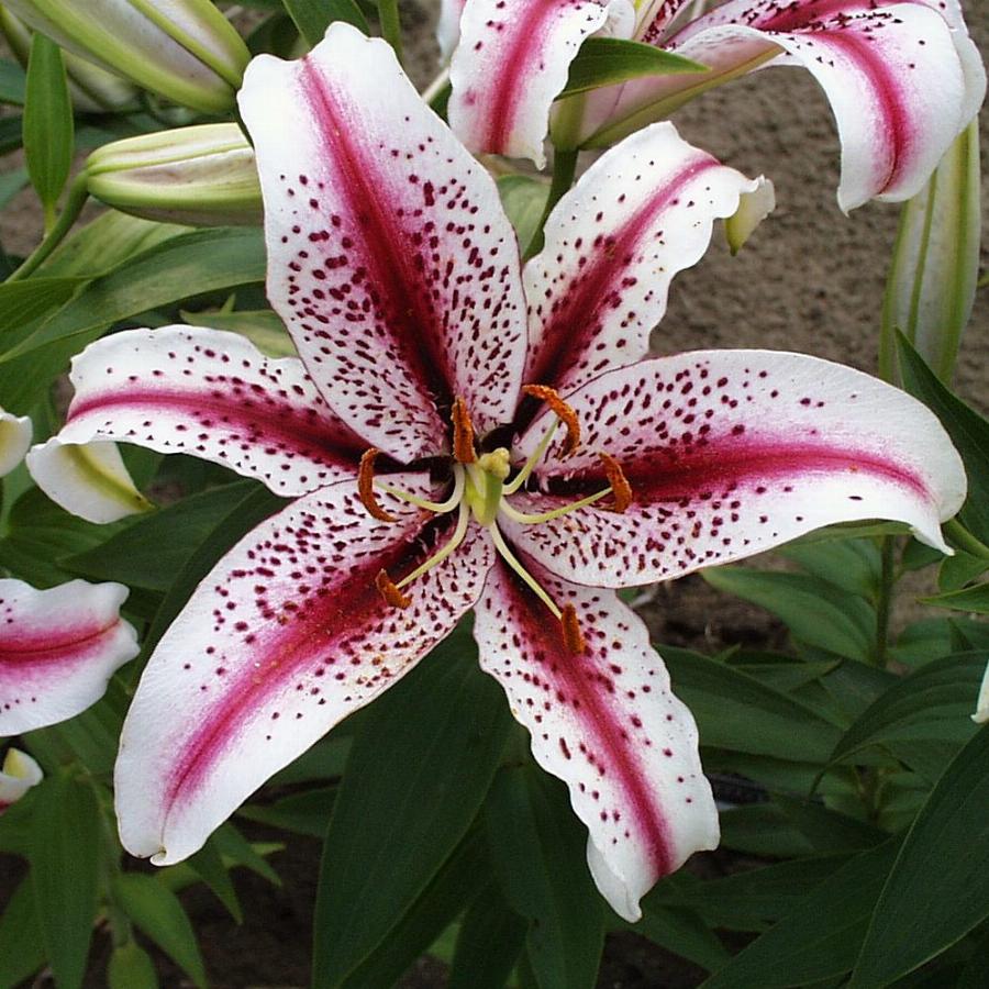 Высота растения 1 м, цветок белый с широкой малиновой полосой до конца лепестков и густым малиновым крапом.