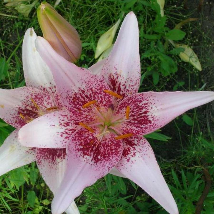 Светло-розовый, многочисленные пурпурные крапинки на лепестках вокруг центра, 20см Нектарники светло-желтыо розовые; пыльца яркая желто-оранжевая. Края лепестков равные, слегка подогнуты. Высота растения 70 см. От посадки до цветения 80 дней.