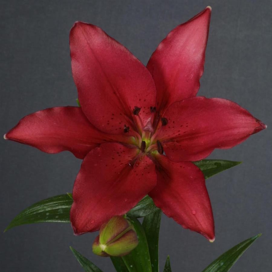 Темно-алая, в центре темный, редкий крап , тычинки и пыльники красные, Внутренняя сторона насыщенно красная и пурпурно-красная; внешняя пурпурно-красная, края темно-красные, в основании немного желто-зеленые; нектарники желто-зеленые с умеренно пурпурно-красным; немного темно красных точек у горла; папиллом нет; пыльца серовато-красно-коричневая; рыльце умеренно пурпурно-красное. Лепестки, не волнистые, кончики слегка загнутые. Диаметр цветка: 20 см. Высота растения 130 см. От посадки до цветения 85 дней.