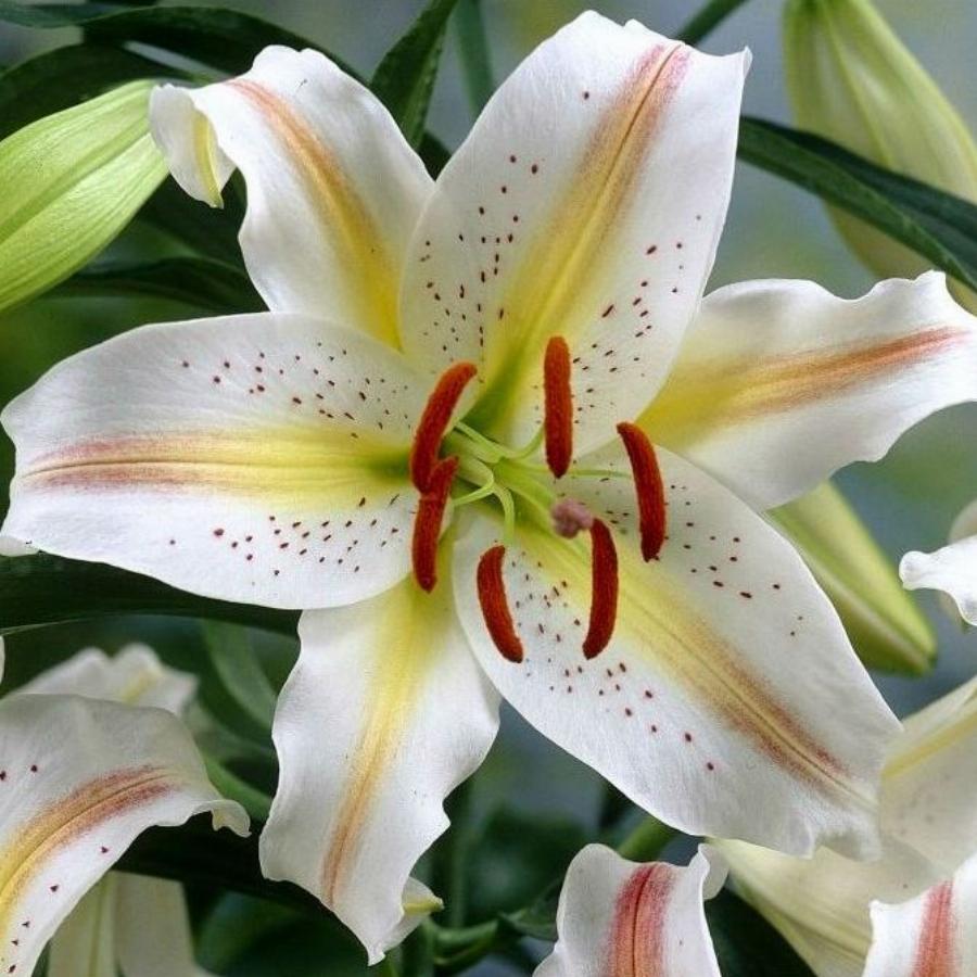 Очень красивая лилия с крупными цветками. Лепестки волнистые с загнутыми краями, белые с яркими, желто-красными полосами и темными крапинами. Высота растения 70-80 см. От посадки до цветения 85 дней.