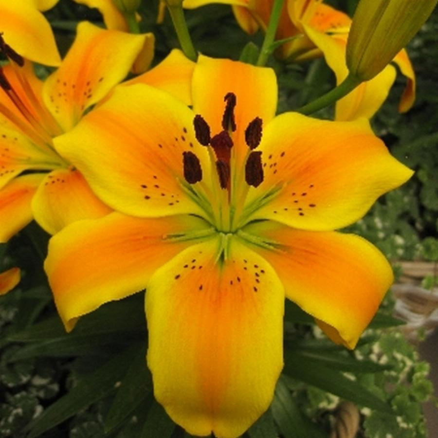 Относится к Азиатским низкорослым гибридам. Цветки диаметром 16 см, ярко-желтые, с широкой абрикосовой полосой по всей длине лепестка, растущие вверх и в бок. Зацветает в конце июня-первой половине июля. Высота растения 0,4 м.