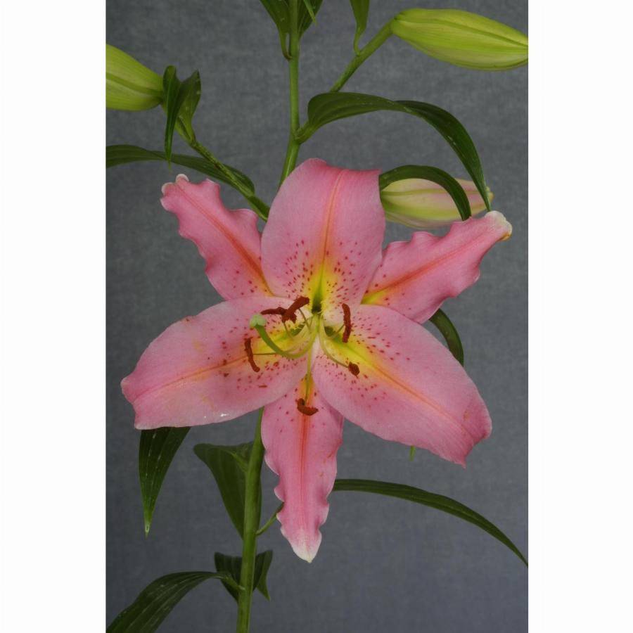 Нежно-розовый с желтой сердцевиной и крапом в центре, по центру лепестков розовые прожилки, легкое гофре. Высота растения до 120 см, от посадки до цветения 105 дней.