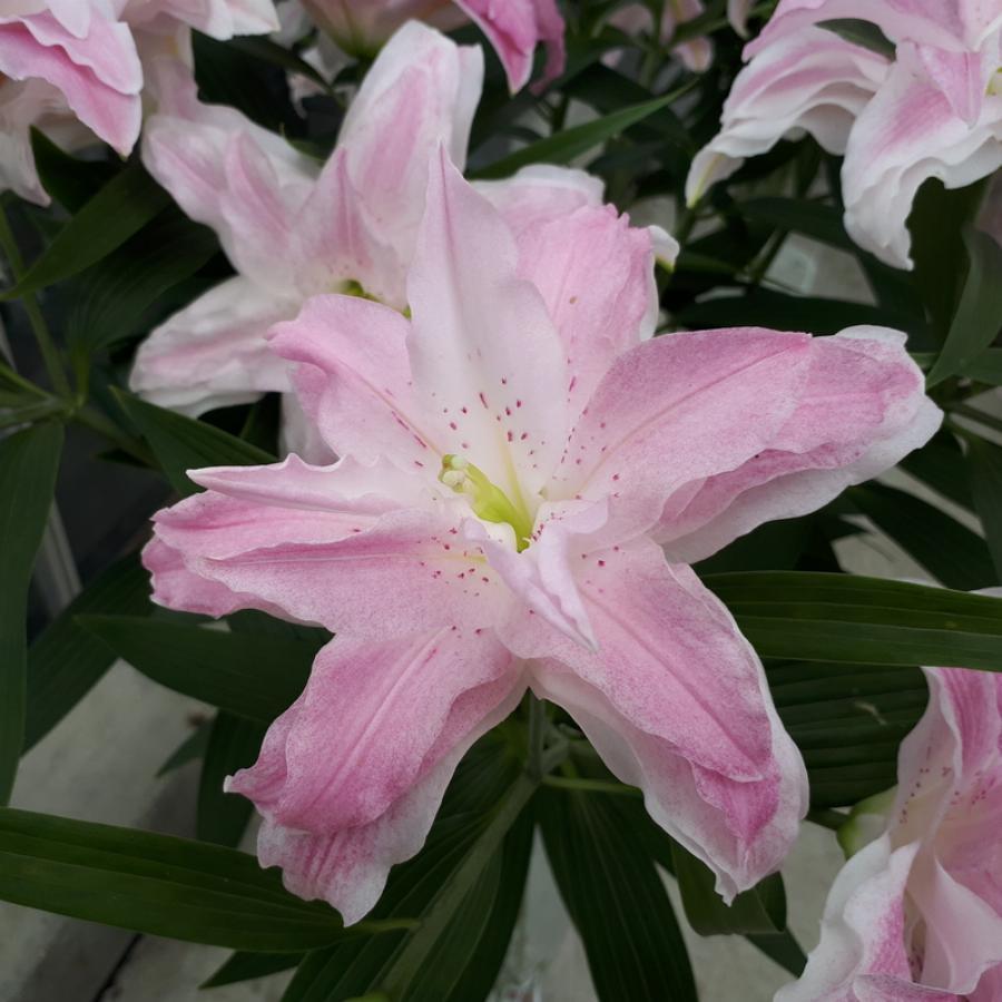 Высота 110 см. Стебли прочные, облиственные. Цветки лилии 21 см в диаметре, нежно-розового цвета с легким краппом и волнистым краями лепестков. Цветок густомахровый. Насыщенный аромат. Период цветения июль-август.