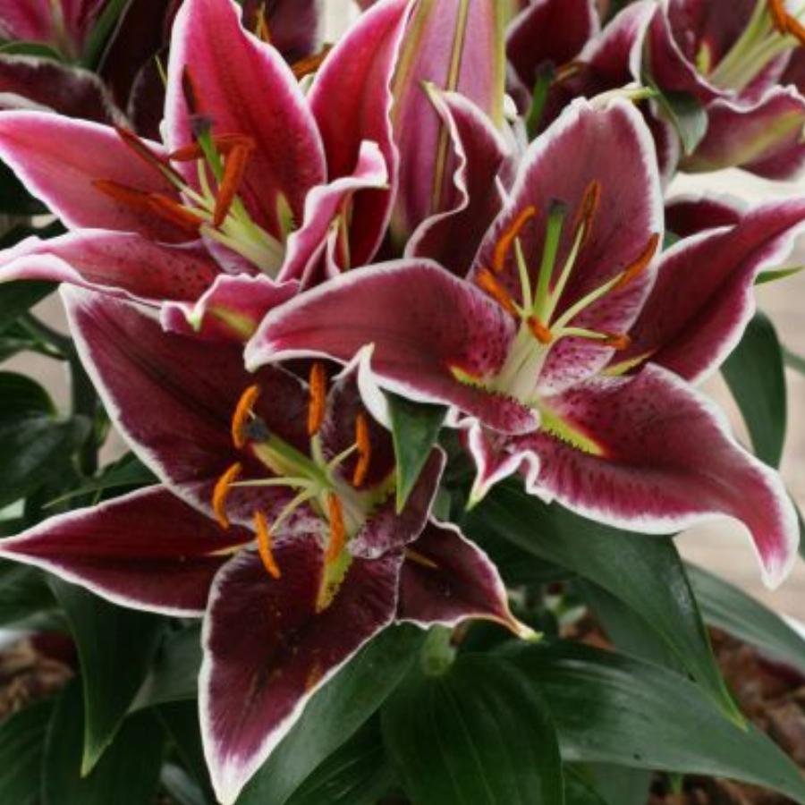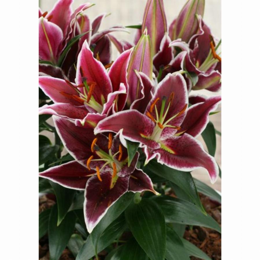 Тёмно-бордовый с белой каймой. Этот сорт относится к специальной группе восточных лилий, выведенных для выращивая в контейнере. Кроме того, что это модное направление, которое позволит вам украсить патио, террасу или балкон. В контейнере можно будет начать выращивание в теплице и легче организовать сухую и теплую зимовку Диаметр цветка 24 см.Высота 55.
