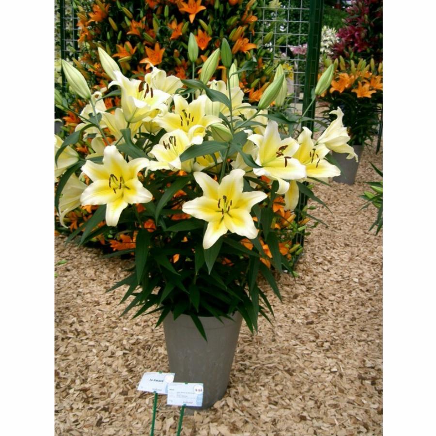 Лилия Manissa- Душистая. Цветки воронковидные, направлены вверх и в сторону; нежно-желтые, в центре окраска более интенсивная, края лепестков почти белые, зев зеленоватый. Лепестки с отогнутыми назад кончиками. ( Vletter & Den Haan Beeher B.V., 2001. )