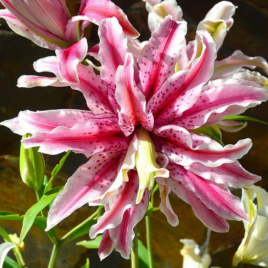 Lilium «Magic Star». Группа восточных гибридов лилий. Фантастический густомахровый сорт. Красивая розовая лилия с красной полосой по центру лепестков, редким вино-красным крапом и белым кантом по краю гофрированных лепестков. Полное отсутствие пыльников. Срок цветения – июль-август. Высота растения 90 см. Диаметр цветка – 15-20 см.