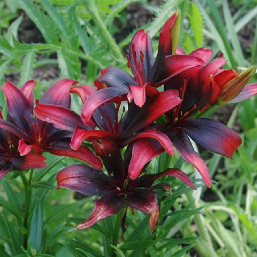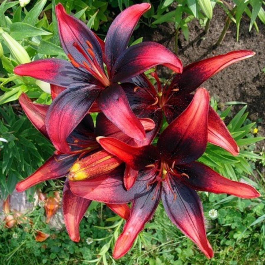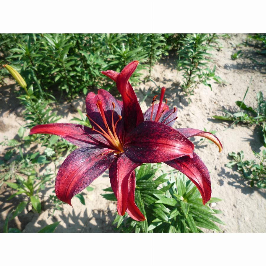 Алый с чёрным плотным напылением до середины лепестка. Высота растения 70 см. От посадки до цветения 85 дней.