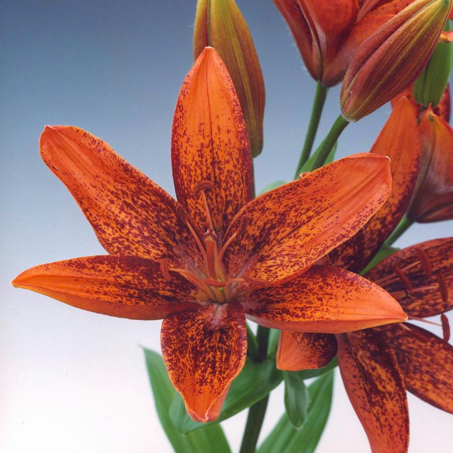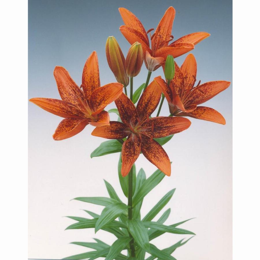 Оранжевая с бордовыми точками. Высота растения 90-100 сми. От посади до цветения 85 дней.