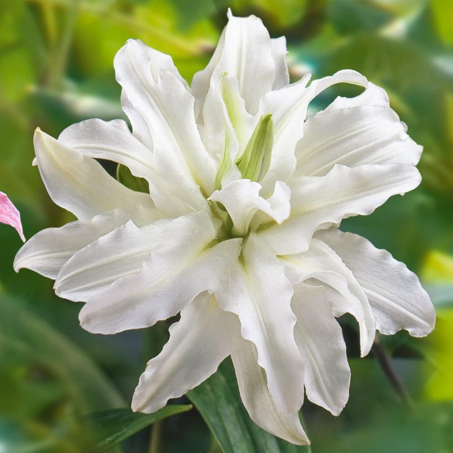 Восточный гибрид. Сильномахровый цветок, напоминающий георгину. Кипенно-белые лепестки с легким зеленовато-кремовым отсветом в центре. Лепестки волнистые по краю, Сильно отгибаются назад. Тычинки отсутствуют. Крапа нет. На стебле распускается от 2 до 6 цветков. От посадки до цветения около 110 дней. Высота растения: 0,9-1,1 м. Длительное цветение.