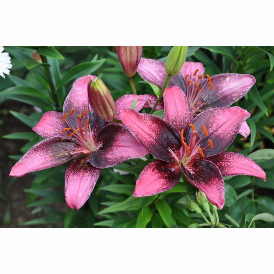 Цветки диаметром 16 см, ярко-розовые, с почти чёрным центром и напылением, классической, звездчатой формы, широко-раскрытые, растущие вверх и в сторону. Зацветает в конце июня-первой половине июля. Высота растения 1 м