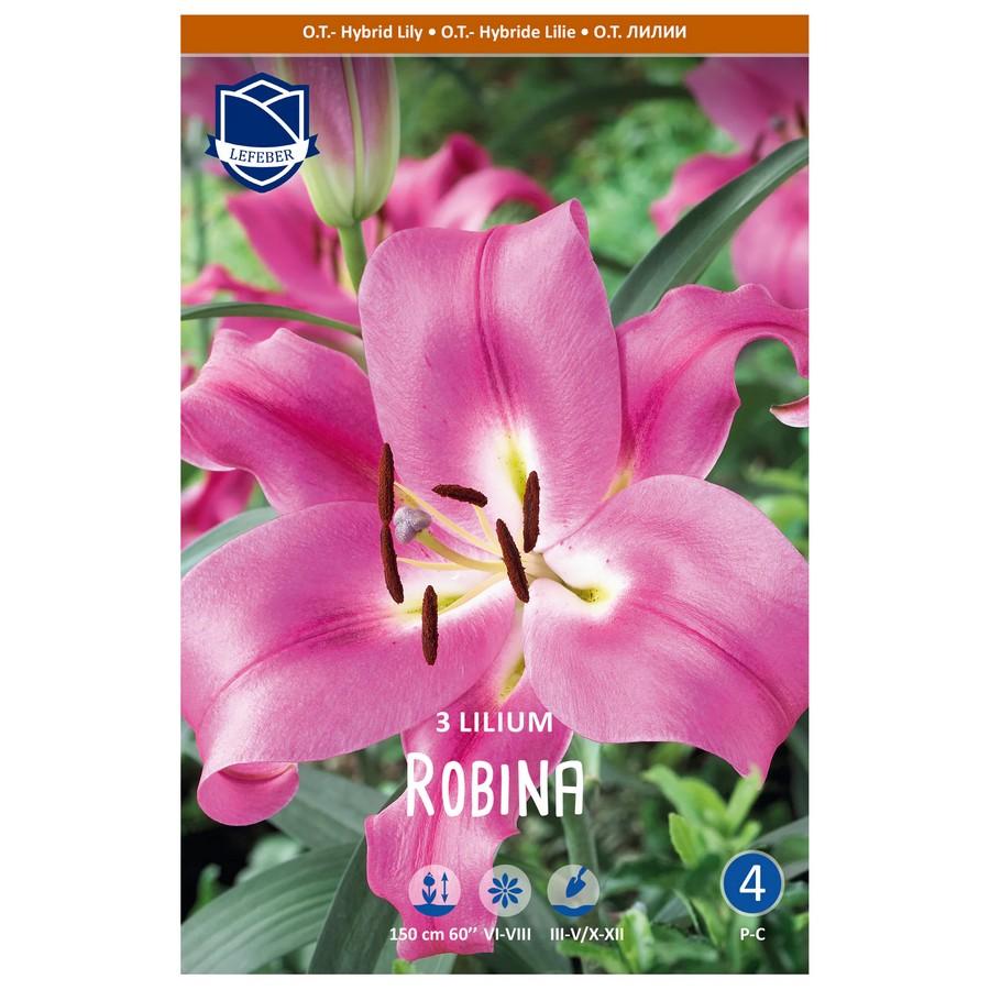 Лилия Робина относится к виду (ОТ) гибридов. Цветки диаметром 20 см, темно-рубиновые. Края лепестков слегка гофрированы, кончики загнутые. Зацветает в июле-августе. Имеет сильный аромат. Высота растения 140 см, на 3 год вырастает до 2,5 м и дает до 30 крупных цветков. Расположение для посадки — открытые и солнечные места. Растение требует укрытия в первый год. Лилия неприхотливая, устойчивая к грибным заболеваниям, зимостойкая. Размножается луковичками — детками и луковичными чешуйками.