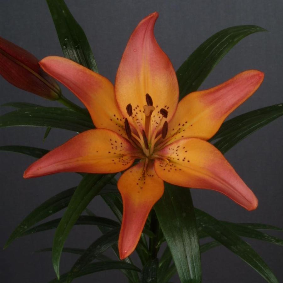 Оранжево-желтый, концы лепестков оранжево-красные, в центре темный крап. Высота растения 110 см. От посадки до цветения 80 дней.