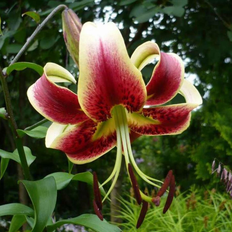 Окрас лилии Scheherazade говорит сам за себя — этот цветок словно сошел к нам со старинного персидского ковра с танцующим восточными красавицами. Взрослые и готовые к срезке лилии в длину достигают одного метра. Удивительные пестрые цветки с благоухающим ароматом появляются на стеблях во второй половине лета. Очень притягательна золотистая окантовка цветков — она делает их еще роскошнее и изысканнее.
