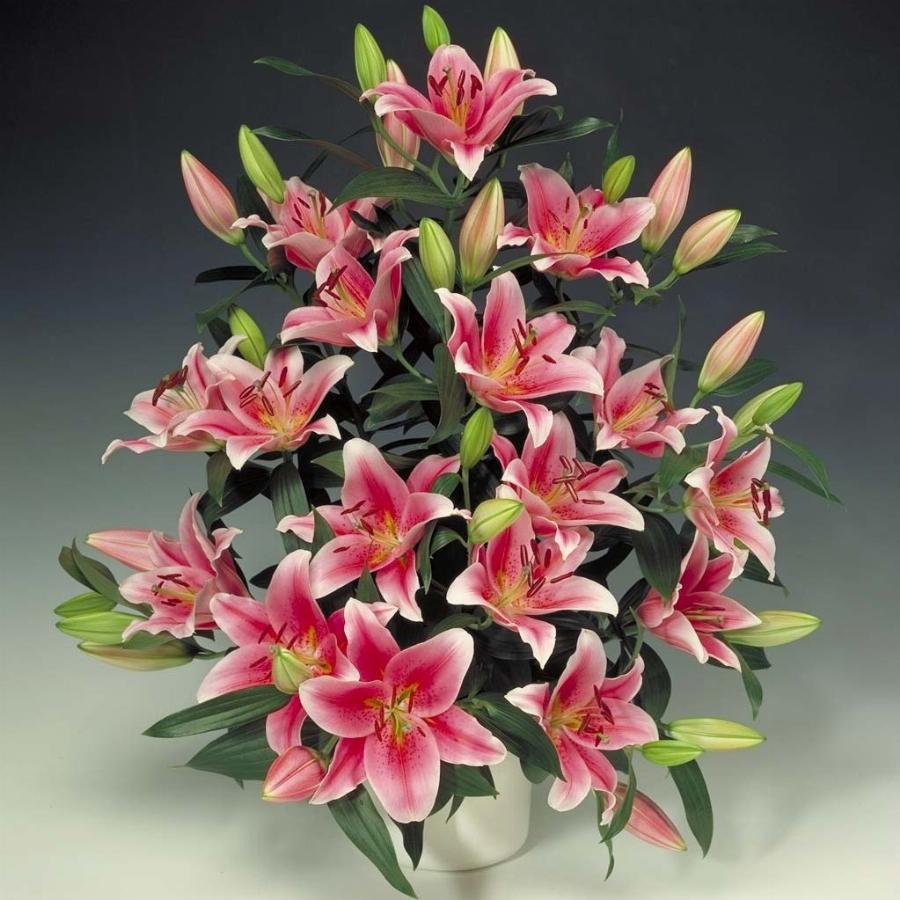 Большие (15-17 см) чашевидные цветки с очень красивой окраской и нежным ароматом. Лепестки ярко-розовые, с широкими белыми краями, к центру покрыты бордовыми крапинами. Высота растения 105 см. От посадки до цветения 95 дней.