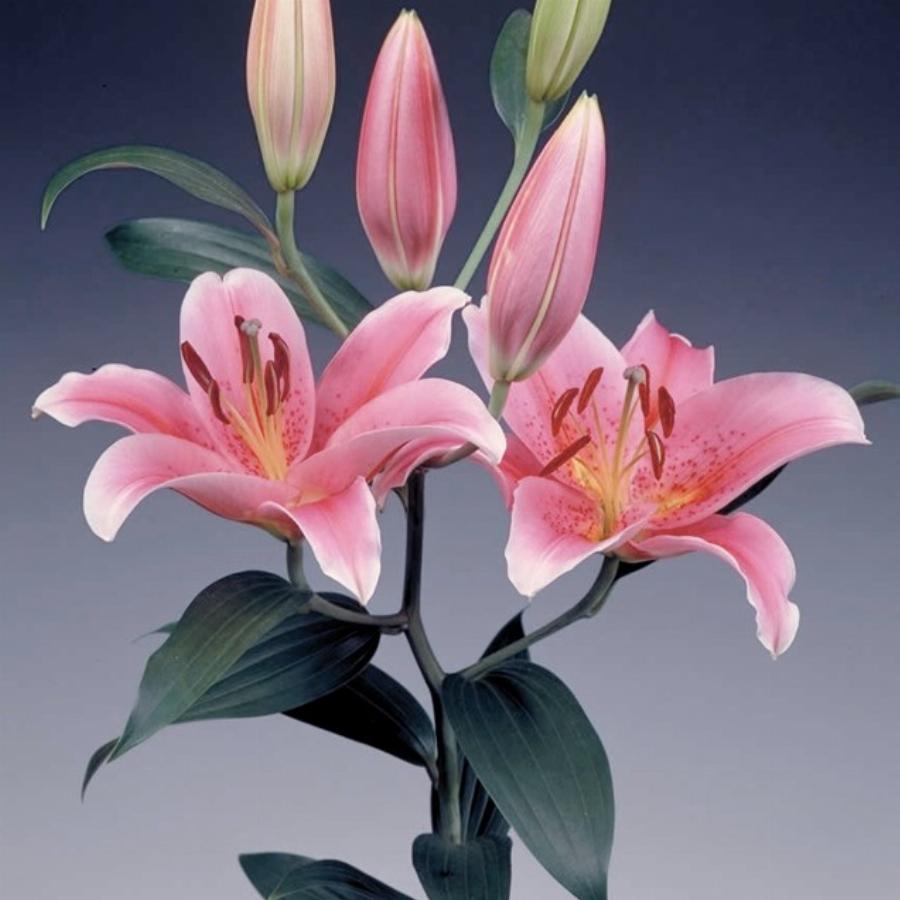 Большие (15-17 см) чашевидные цветки с очень красивой окраской и нежным ароматом. Лепестки ярко-розовые, с широкими белыми краями, к центру покрыты бордовыми крапинами. Высота растения 105 см. От посадки до цветения 95 дней.