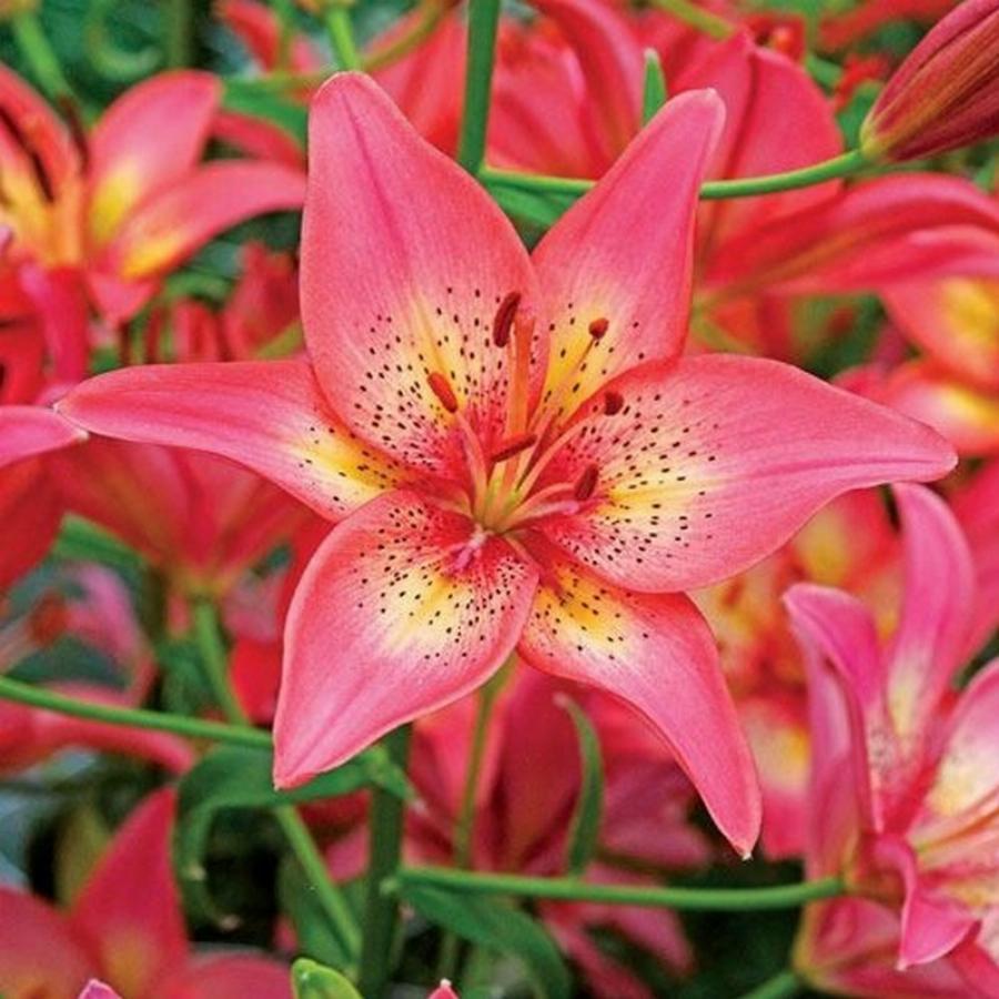 Яркая и одновременно нежная лилия в розовом окрасе. Кончики ее лепестков имеют более насыщенный окрас, а серединка цветка сияет пастельно-желтым цветом. Эта лилия привносит нотки лета и экзотичности в сад. Высота: 70-100 см. Размер цветка:11-15 см. Цвет: Розово-желтый.