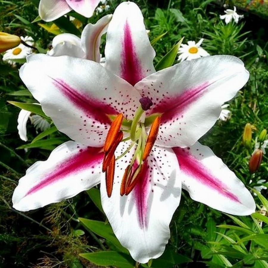 Высота лилий Хотспот 120 см. Относится к группе азиатских гибридов. Цветки белого цвета с широкими лучами красно-розового цвета вдоль лепестка, а так же крапом