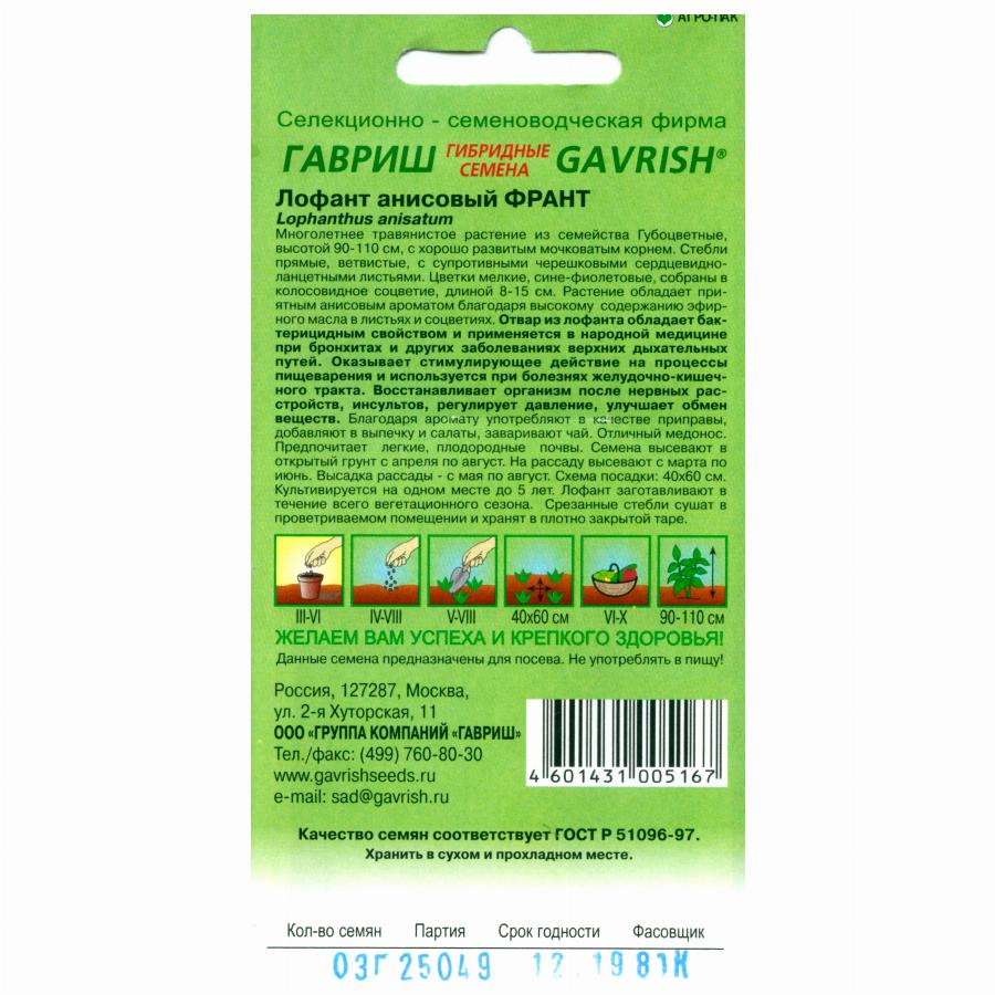 Многолетнее травянистое растение семейства губоцветные, высотой 90-110 см, с хорошо развитым мочковатым корнем. Стебли прямые, ветвистые, с супротивными, черешковыми сердцевидно-ланцетными листьями. Цветки мелкие, сине-фиолетовые, собраны в колосовидное соцветие, длиной 8-15 см. Растения обладают приятным анисовым ароматом благодаря высокому содержанию эфирного масла в листьях и соцветиях. отвар из лофанта обладает бактерицидным свойствами и применяется в народной медицине при бронхитах и других заболеваниях верхних дыхательных путей. Оказывает стимулирующее действие на процессы пищеварения и используются при болезнях желудочно-кишечного тракта. Восстанавливает организм после нервных расстройств, инсультов, регулирует давление, улучшает обмен веществ. Благодаря аромату употребляют в качестве приправы, добавляют в выпечку и салаты, заваривают чай. Отличный медонос. предпочитает легкие, плодородные почвы. Семена высеивают в открытый грунт с апреля по август. На рассаду высевают с марта по июнь. Высадка рассады — с мая по август. Схема посадки: 40х60 см. Культивируется на одном месте до 5 лет. Лофант заготавливают в течении всего вегетативного сезона. Срезанные стебли сушат в проветренном помещении и хранят в плотно закрытой таре.