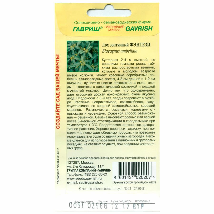 Кустарник 2- 4 м высотой, со средними темпами роста, гибкими распростертыми ветвями, которые в молодом возрасте имеют колючки. Имеет красивые серебристые побеги и эллипсовидные листья, 4-8 см длиной и 1-2 см шириной, душистые цветки появляются в июле, плоды – костянки с эллиптической косточкой и сладкой мучнистой мякотью. Ценно тем, что одновременно, дает oгpoмный урожай ярко-красных, очень вкусных ягод. Плодоносит с 8-9 лет, плоды созревают в октябре. Растение неприхотливое, светолюбивое, засухоустойчивое, со средней зимостойкостью, хороший медонос. Размножаются семенами, корневыми отпрысками и черенками. Основной способ размножения — семенной. Семена высевают осенью или весной после 3-месячной стратификации в холодильнике при температуре 1-3 о С. Представляет интерес как декоративное растение. Хорошо переносит стрижку, при посадке “на пень” дает обильную поросль, что позволяет использовать его для создании живых изгородей. Рекомендуется для использования в одиночных и групповых посадках, на светлых опушках, при создании контрастных групп.