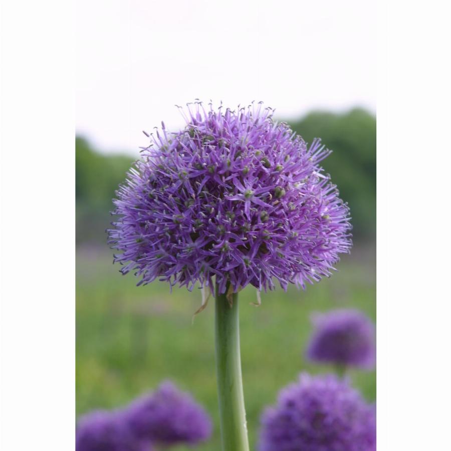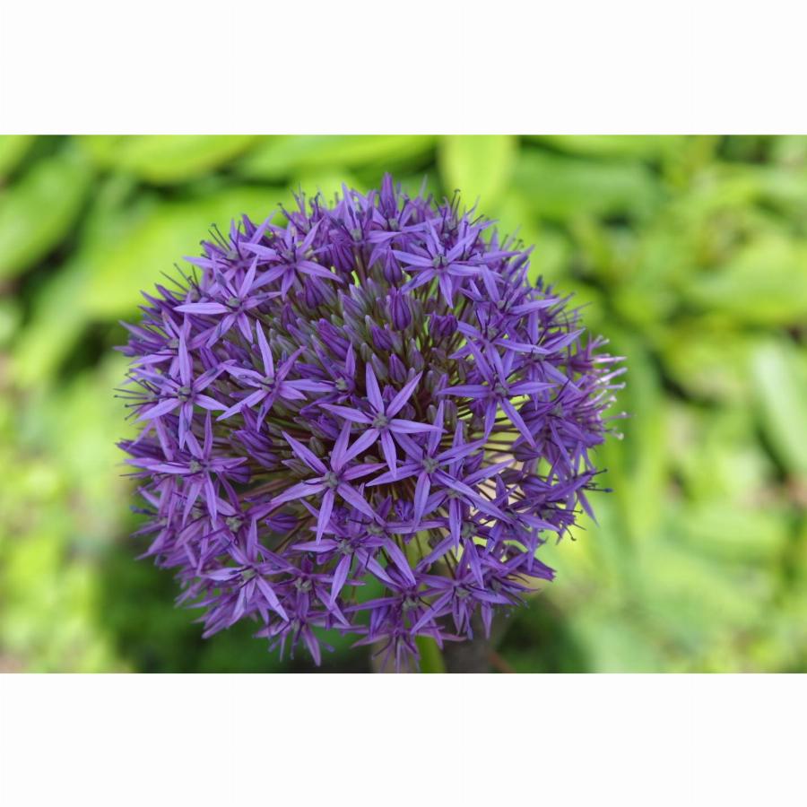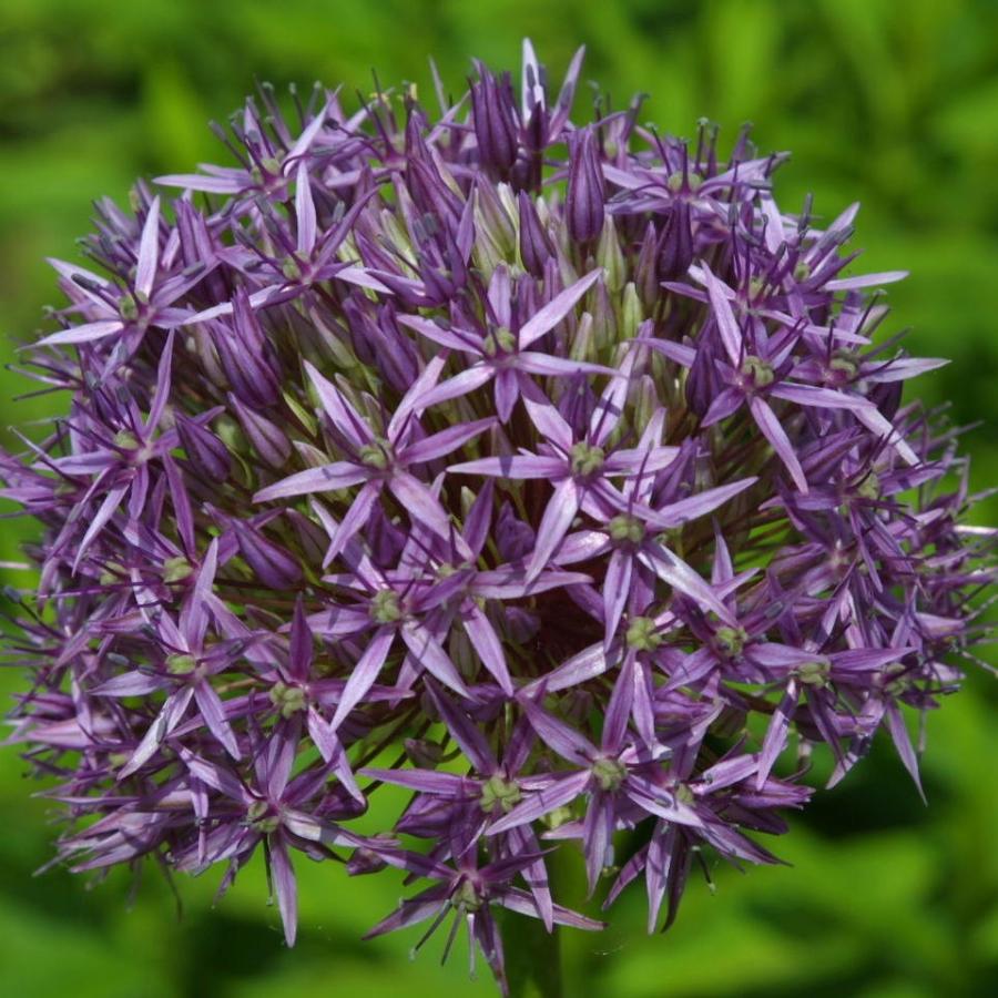 Стрелки до 120 см высотой. Листья ремневидные, короче цветоноса, шириной до 10 см, зеленые или сизо-зеленые. Соцветие шаровидное, густое, многоцветковое, до 8 см в диаметре.Цветки звездчатые фиолетовые. Цветение с июня около 20 дней.