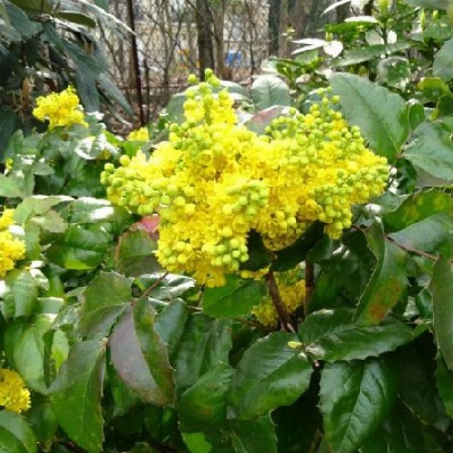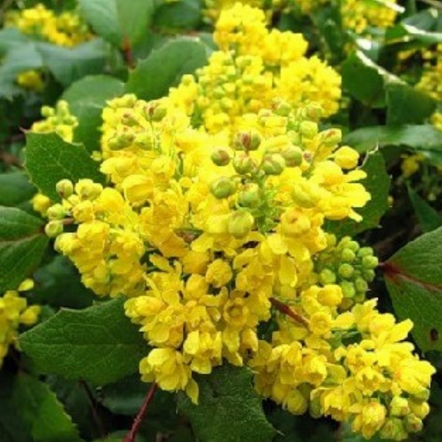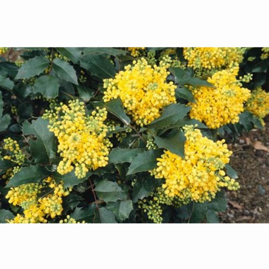 Кустарник. Высота и диаметр кроны 1м. Крона широкораскидистая, плотная. Цветки желтые, душистые, собраны в многоцветковые кисти. Плоды черно-синие, съедобные. Место: Тень-полутень. Почва: Свежая, богатая, суглинистая. Не переносит уплотнения. Листва: Вечнозеленые, кожистые, темно-зеленые, блестящие. К зиме — фиолетово-коричневые.