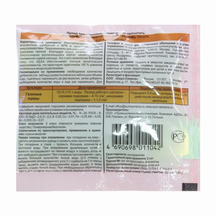 Используется как для корневой, так и для внекорневой подкормки. При норме разведения 10 г удобрения на 10 л воды, пакета объемом 50 г достаточно для получения 50 л подкормочного раствора. Кристаллическое, многокомпонентное удобрение с NPK и хелатизированными микроэлементами для корневой и некорневой подкормки газонов. Характеризуются пониженной нормой расхода и практически 100 % усвоением питательных веществ растениями. Массовая доля питательных веществ, %: N –25, P2O5 – 8; K2O – 8; MgO – 2,0; S – 2,2; B -0,02; Cu – 0,01; Fe – 0,05; Mn – 0,05; Mo – 0,005; Zn – 0,01