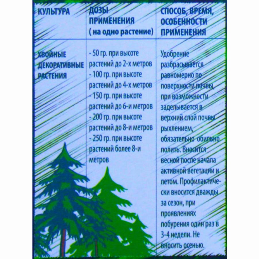 Для подкормок хвойных растений, устранения и профилактики побурения хвои, вызванной недостатком магния.