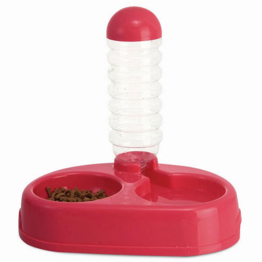 Кормушка-автопоилка — это функциональный аксессуар 2 в 1. Корм насыпается в миску, а вода — в вертикальный стакан. Под действием атмосферного давления вода удерживается в нем и дозированно поступает во вторую миску по мере выпивания животным. Использование кормушки-автопоилки гарантирует чистоту и доступность воды для домашнего питомца в любое время. При этом все элементы кормушки выполнены из качественного пластика и легко разбираются на составные части, что очень удобно при гигиенической обработке и транспортировке изделия. Цвет: малиновый, молочный. Объем: 900мл. Размер изделия: 310х215х300мм.