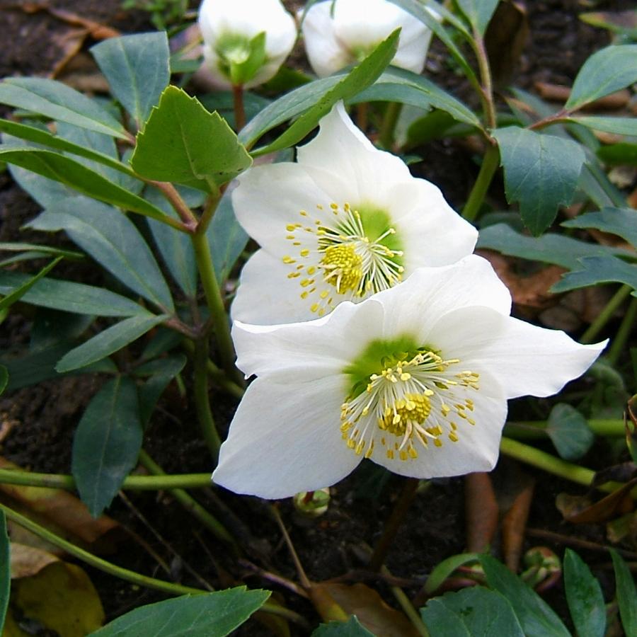 Один из самых красивых и популярных видов. Вечнозеленый многолетник до 30 см высотой. Цветки у него очень крупные, обычно до 8 см в диаметре, снежно-белые, только снаружи с легким розовым оттенком, который с возрастом постепенно усиливается. Что еще ценно: цветок смотрит почти вверх, а не поникает как у большинства морозников. Зимостоек до -35 град. Цветоносы 30-60 см в высоту. Цветет с начала апреля 10-12 дней. Морозники предпочитают полузатененные места среди деревьев и кустарников, но они хорошо выдерживают и не очень глухую тень, и солнце при регулярном поливе.