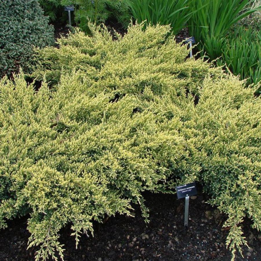 Описание: интересный сорт можжевельника чешуйчатого. Высота взрослого растения: 0,3 — 0,5 м., при диаметре кроны: чуть более 1 м. Крона — подушковидная; побеги отрастают либо горизонтально, либо под небольшим углом вверх; концы же побегов могут несколько свисать. Хвоя — желтовато-светло-зелёная или светло-зелёная. Плоды — небольшие, округлые, тёмно-синие с сизым налетом шишка-ягоды, образуются в небольшом количестве. Зона зимостойкости: 4b (растение достаточно морозоустойчиво, но в первый год после посадки на постоянное место молодой можжевельник можно укрыть на зиму от морозов).