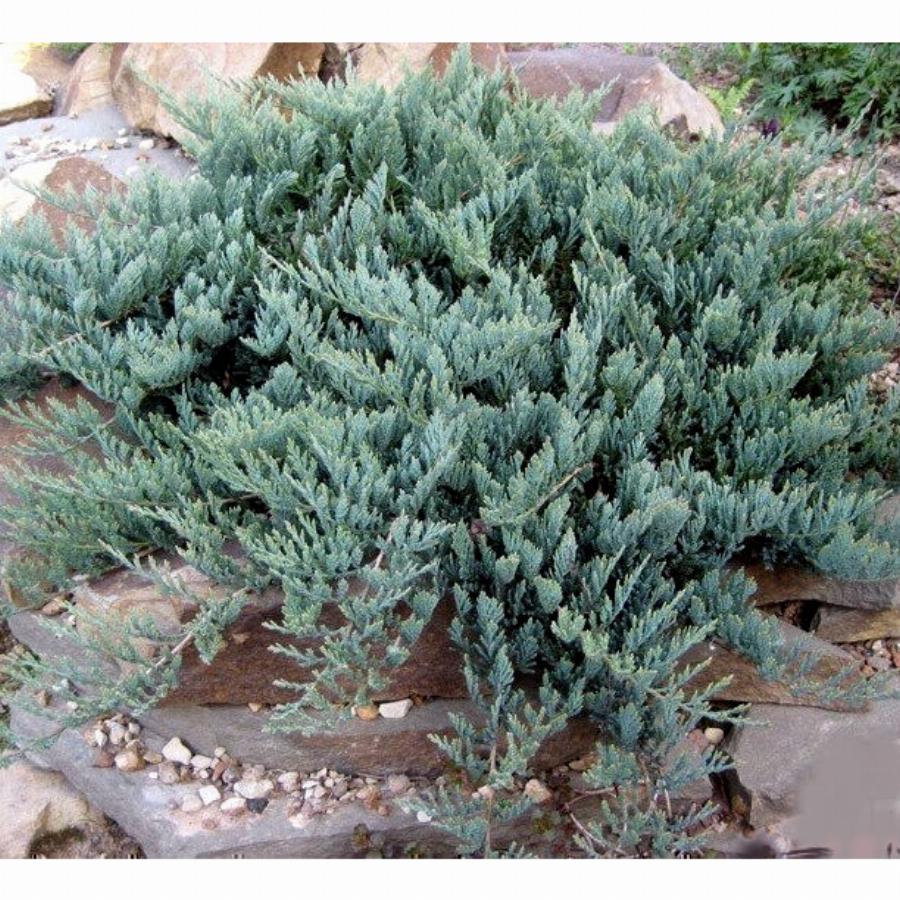 Стелющийся невысокий кустарник со средней скоростью роста. В возрасте 10 лет он достигает 0,2м в высоту при диаметре 1,5м. Это кустарник с ползущими по земле побегами, концы которых легко поднимаются. Мелкая хвоя серебристо-голубого цвета зимой приобретает фиолетовый оттенок. Blue Chip переводится как голубой осколок. Этот кустарник родом из Северной Америки. Светолюбивая, морозостойкая форма, к почве не требовательна, но не переносит застоя влаги и засоления.