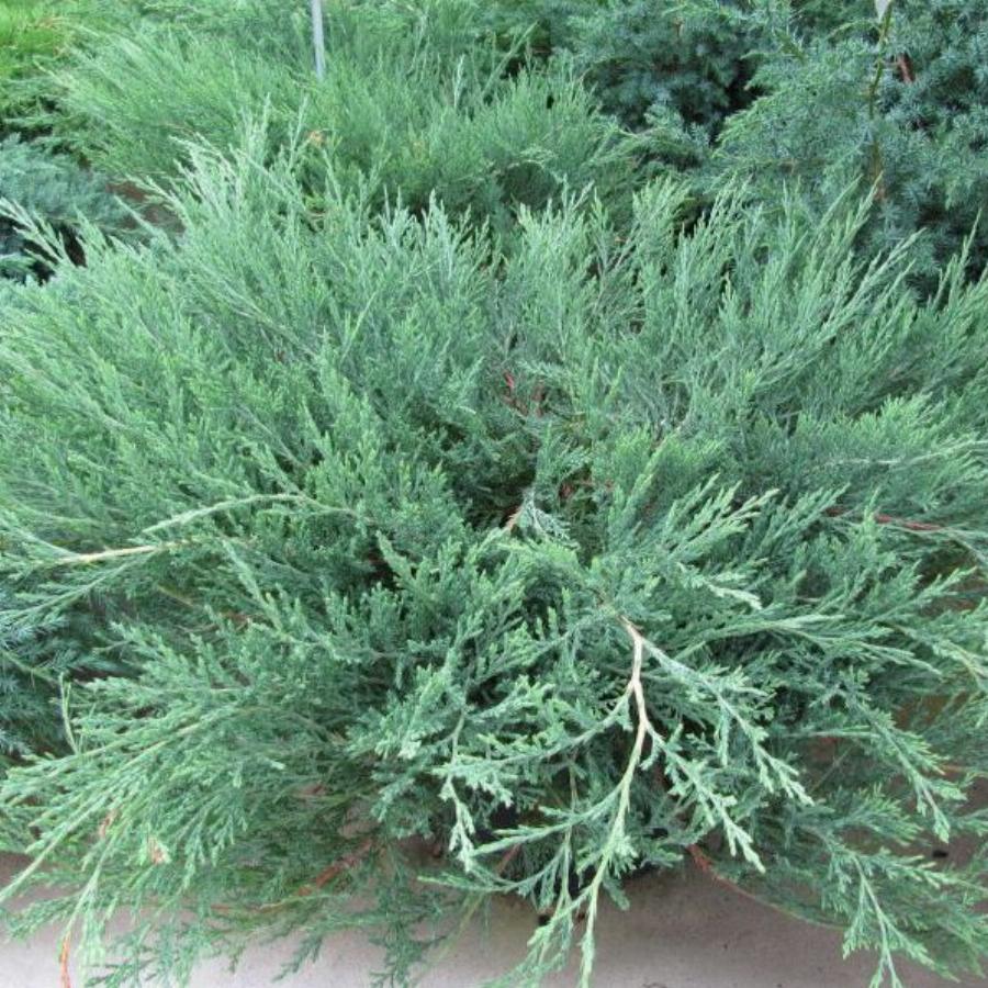 Карликовая форма. Кустарник. Высота 0,4 — 0.5 м, диаметр кроны 2 м. Крона стелющаяся. Кора серо-бурая. Хвоя чешуйчатая, серебристо-голубая. Растет медленно. Долговечен. Светолюбив, но выносит небольшое затенение. Предпочитает достаточно влажные, супесчаные почвы. Морозостоек. Применение: одиночные и групповые посадки. Используется как почвопокровное растение на каменистых горках. Считается самым голубым из сортов горизонтальных можжевельников.