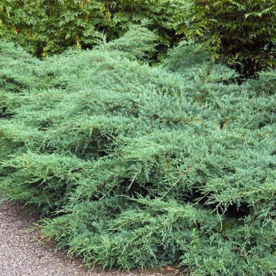 Вечнозеленый кустарник с сильными, диагонально приподнятыми или горизонтально лежащими ветвями и свисающими концами побегов. Достигает высоты 30-50 см, диаметра кроны 1,5-2м. Годовой прирост в высоту 10см, в ширину 10-20см. Образует мясистые, шаровидные, серо-голубые с сизым налетом шишкоягоды, известные как можжевеловые ягоды. Следует знать, что все части растения очень сильно ядовиты! Хвоя чешуйчатая, внутри кроны игольчатая, серо-голубая или серо-зеленая, длиной 0,5-0,7 см. Предпочитает плодородные почвы, не переносит переувлажнения. Светолюбив.