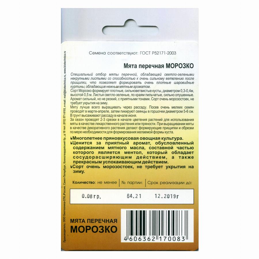 Сорт Морозко формирует плотные, сильноветвистые кусты, диаметром 0,3-0,4 м., высотой 0,5 м. Листья светло-зеленые, по краям пильчатые, сильно опушенные. Аромат сильный, ноне резкий с приятными тонами. Сорт очень морозостоек, не требует укрытия на зиму. Мяту лучше всего выращивать через рассаду. Посев очень мелких семян проводят в марте-апреле, затем пикируют сеянцы в горшочки диаметром 5-6 см. В грунт высаживают рассаду в начале июня.