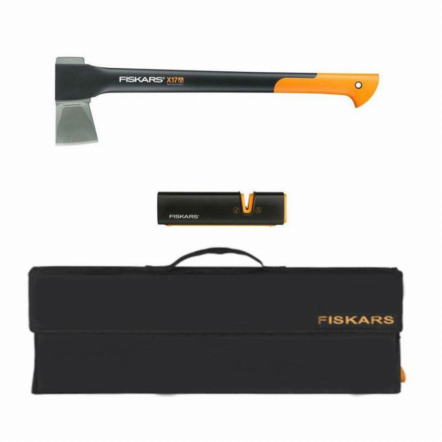 В наборе: Топор-колун Fiskars X17,универсальная точилка,сумка для хранения и переноски инструментов.Топор разработан в первую очередь для заготовки дров. Форма лезвия позволяет эффективно колоть поленья среднего размера.Новая форма лезвия слегка закруглена, благодаря чему его легче вытаскивать из бревна.Вес лезвия: 1086 г.Лезвие двойной закалки с тефлоновым покрытием.Топорище изготовлено из прочного, долговечного, легкого материала, который устойчив к засушливой, влажной погоде.Рукоятка изготовлена из упругого аммортизирующего материала, с удобным захватом.Конец рукоятки в форме крюка, для безопасного использования.Рукоятка запрессована в топорище методом литья под давлением.Пластмассовая щека также гарантирует надежную фиксацию лезвия. Точилка сохранит Ваш топор острым.Керамические шлифовальные камни затачивают лезвия топоров и ножей под правильным углом. 2 в 1.Четко обозначенные пазы для топоров и ножей.